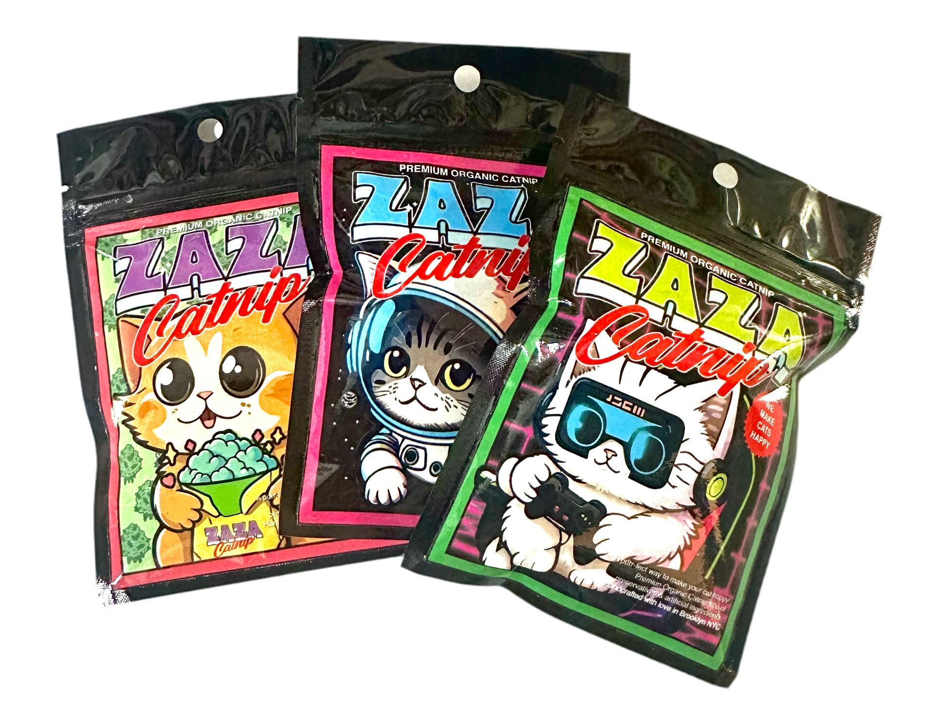 A set of three 5oz sachets of fresh and organic Zaza catnip, each pack comes with 3 different designs.